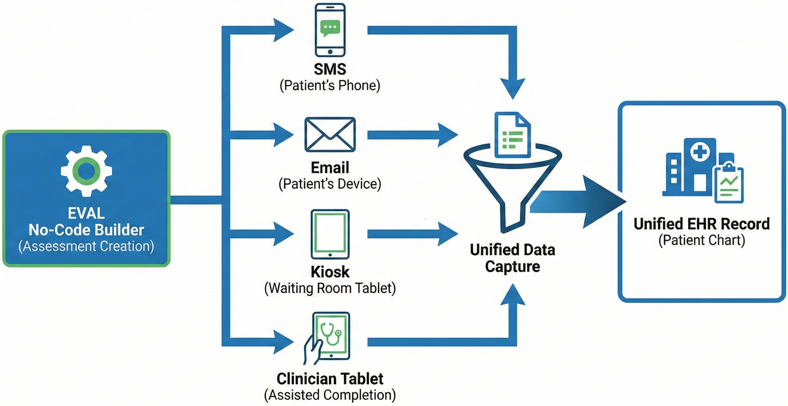 Figure 1: EVAL Multi-Channel Architecture. A single assessment built in the no-code builder is delivered across multiple channels, with all data funneling back into a unified EHR record.