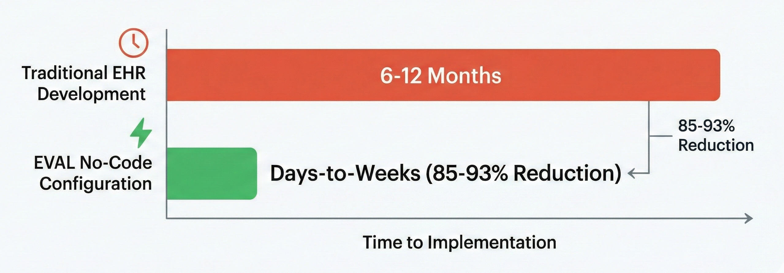 Figure 3: Implementation Time Comparison. EVAL's no-code platform significantly reduces the time to deploy clinical assessments compared to traditional EHR development cycles.
